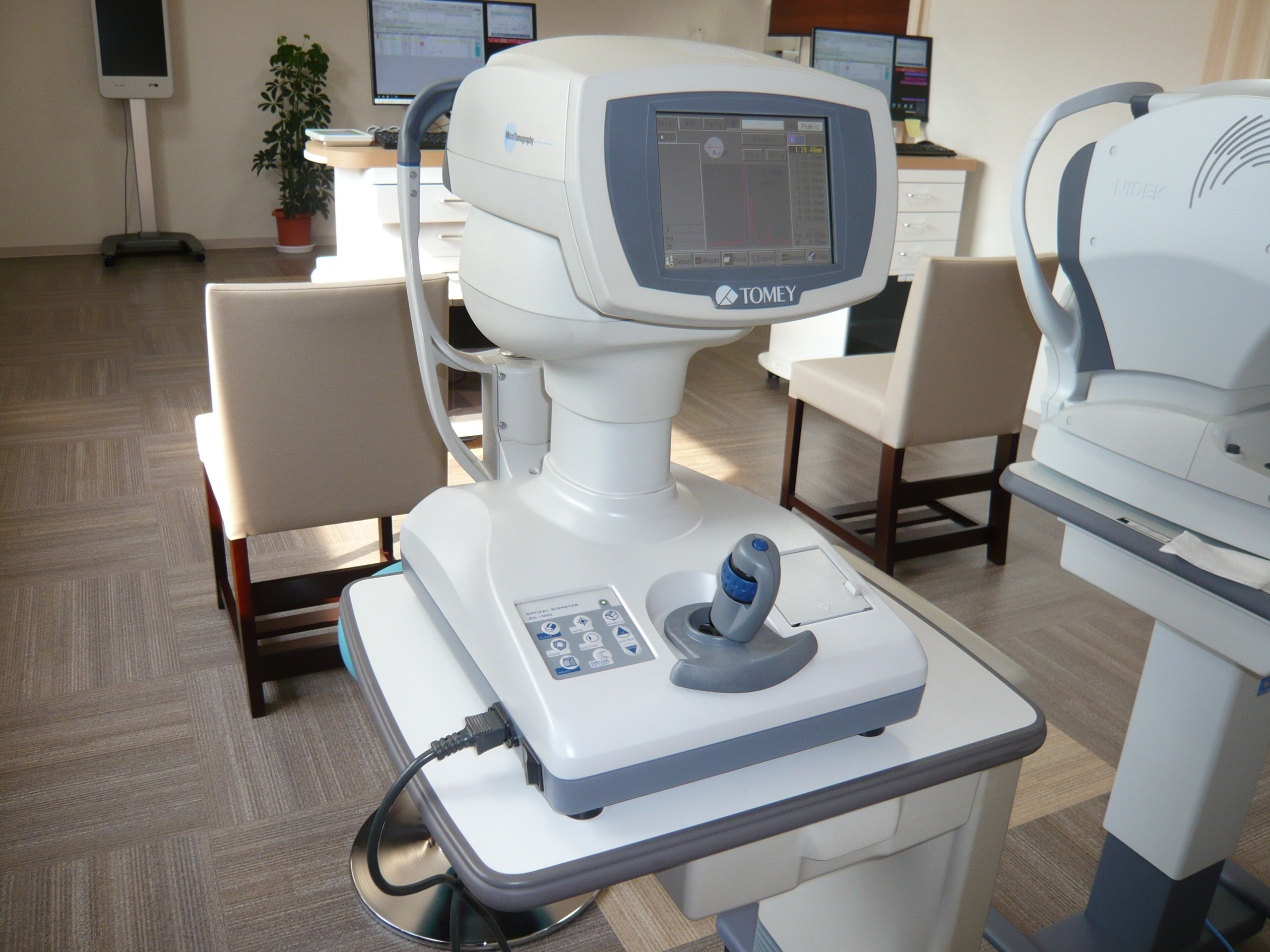 何種類かの明るさ、大きさの違った視標を使って視野全体を定量的に測定できる機器で、ハンフリー視野計では把握の難しい緑内障末期の方の視野などを測定するのに適しています。